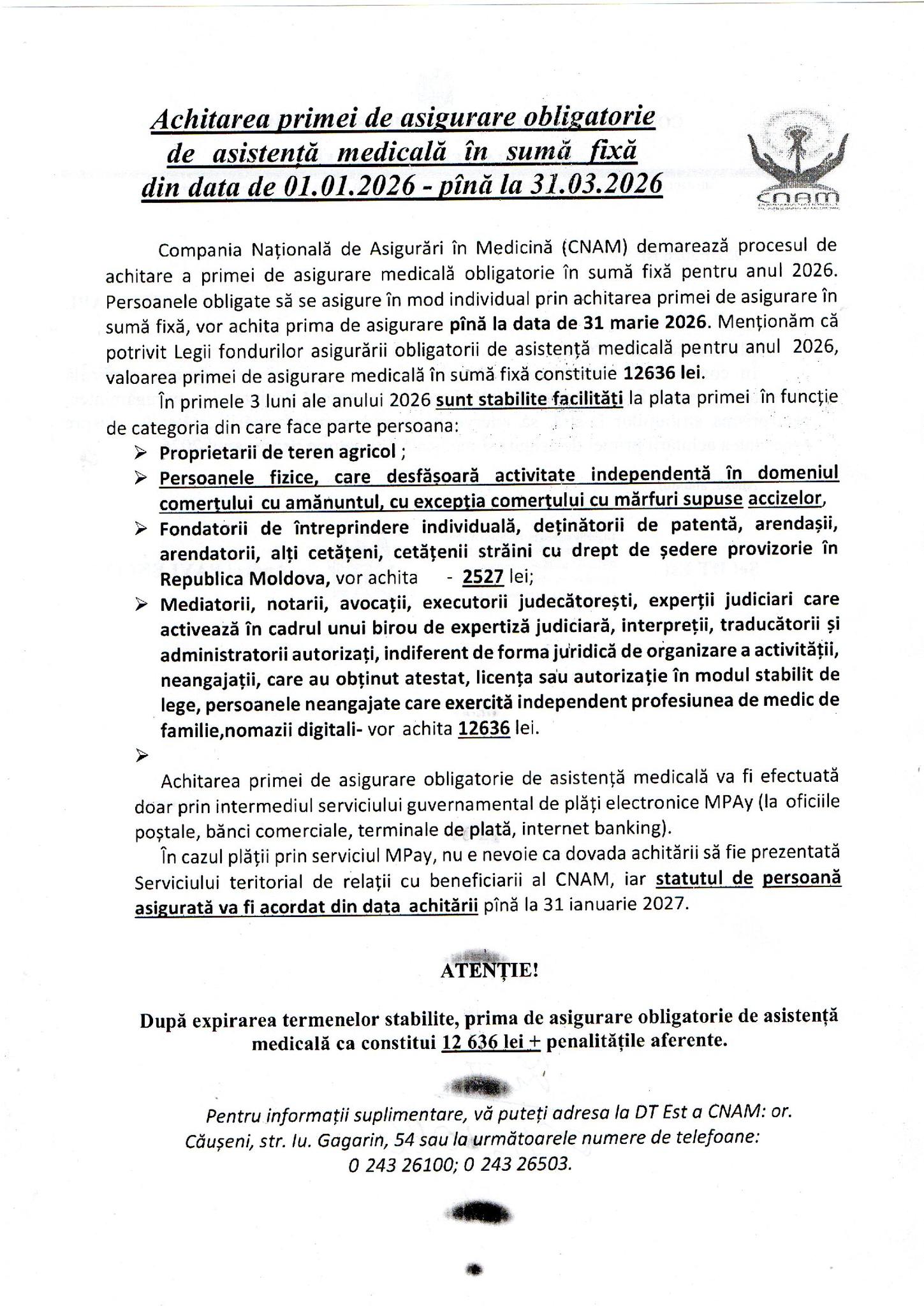 Achitarea primei de asigurare obligatorie de asistență medicală în sumă fixă pentru anul 2026